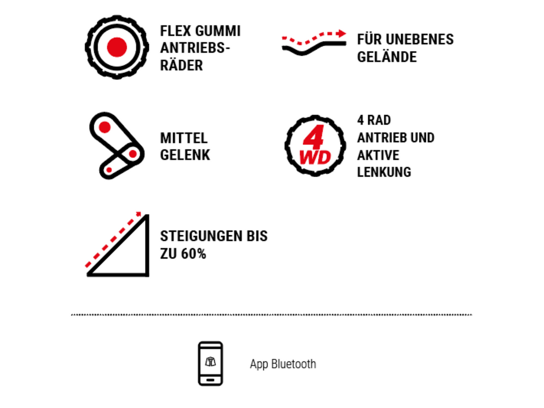 Steigungswunder: Dank des innovativen 4WD-Systems meistert der BX4 4WD beeindruckende Steigungen von bis zu 60% (55 % am Draht!) Hügelige Gärten oder unebenes Gelände sind für ihn kein Hindernis mehr. Er erreicht mühelos Bereiche, die für herkömmliche Mähroboter unerreichbar bleiben.