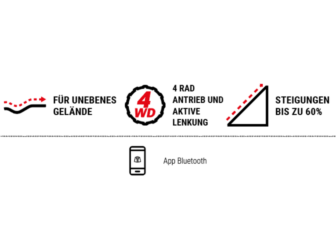 Unschlagbare Geländegängigkeit: Mit seinem innovativen Allradantrieb bewältigt der LX4 4WD mühelos Steigungen bis zu 60% und 55 % auch am Begrenzungsdraht. Egal ob hügeliges Gelände oder rutschige Oberflächen – dieser Roboter bleibt stets trittsicher und effizient.