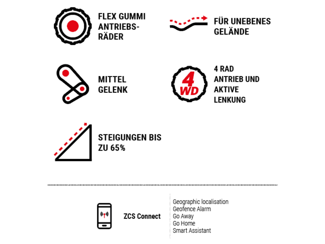 **Das ZCS Connect Modul ist ein Bauteil welches dem Roboter die Kommunikation über das GSM Netz (Multi-Netz eSIM) und die Nutzung von GPS Daten ermöglicht. Die GSM Funktionen dienen zum Erhalt von Status Mitteilungen in die Smartphone App TECH Remote (z.B. Arbeitsstatus und Position) sowie dem Senden einfacher Befehle (Mähen bis, Laden bis usw.). Die GPS Funktionen dienen hauptsächlich der Positionsbestimmung (Geofence Diebstahlsicherung) und zur Erstellung einer Karte der Mähfläche, was die Leistung optimiert. In den Modellen Tech S6, Tech L8, Tech L20 sowie Next Tech LX2 ZR und LX2 ZR EVO sind nur die Funktionen des GSM sowie der Geofence Diebstahlschutz verfügbar.
